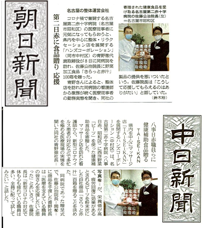 コロナ禍で奮闘する医療従事者の皆様に元気になって頂くため、2021年3月8日に弊社の取り扱う健康食品「さらっと赤汁」を名古屋第二赤十字病院(八事日赤)に100箱寄付いたしました。